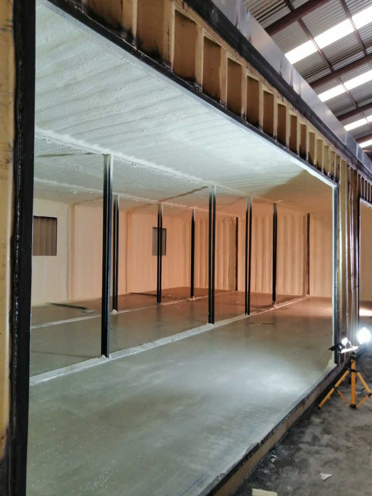 Para realizar este aislamiento hemos utilizado poliuretano proyectado ya que gracias a sus cualidades conseguimos una buena impermeabilización de habitáculo y además queda aislado térmicamente, lo que era de gran importancia en este trabajo ya que los containers son utilizados como casas.