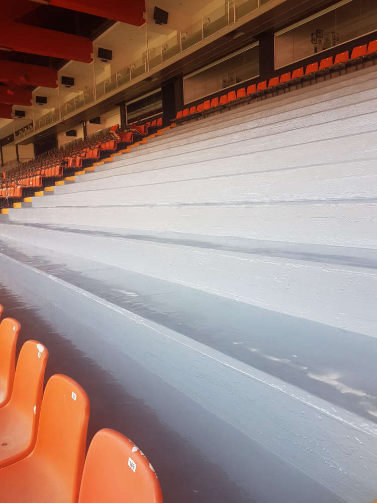 Impermeabilización de gradas con poliurea, hemos realizado el aislamiento de la tribuna del mítico estadio de Mestalla para el club de fútbol Valencia.